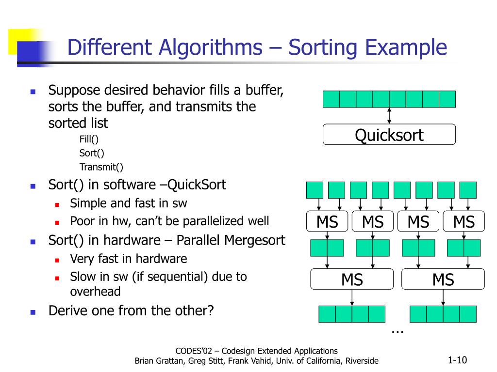 Different Algorithms – Sorting Example • Suppose desired behavior fills a buffer, sorts the buffer, and transmits the sorted list Fill() Sort() Transmit() • Sort() in software –QuickSort • Simple and fast in sw • Poor in hw, can’t be parallelized well • Sort() in hardware – Parallel Mergesort • Very fast in hardware • Slow in sw (if sequential) due to overhead • Derive one from the other? Quicksort MS MS MS MS MS MS … CODES’02 – Codesign Extended Applications Brian Grattan, Greg Stitt, Frank Vahid, Univ. of California, Riverside