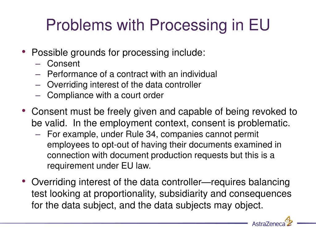 Problems with Processing in EU • Possible grounds for processing include: • Consent • Performance of a contract with an individual • Overriding interest of the data controller • Compliance with a court order • Consent must be freely given and capable of being revoked to be valid. In the employment context, consent is problematic. • For example, under Rule 34, companies cannot permit employees to opt-out of having their documents examined in connection with document production requests but this is a requirement under EU law. • Overriding interest of the data controller—requires balancing test looking at proportionality, subsidiarity and consequences for the data subject, and the data subjects may object.