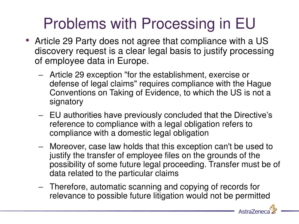 Problems with Processing in EU • Article 29 Party does not agree that compliance with a US discovery request is a clear legal basis to justify processing of employee data in Europe. • Article 29 exception "for the establishment, exercise or defense of legal claims" requires compliance with the Hague Conventions on Taking of Evidence, to which the US is not a signatory • EU authorities have previously concluded that the Directive’s reference to compliance with a legal obligation refers to compliance with a domestic legal obligation • Moreover, case law holds that this exception can't be used to justify the transfer of employee files on the grounds of the possibility of some future legal proceeding. Transfer must be of data related to the particular claims • Therefore, automatic scanning and copying of records for relevance to possible future litigation would not be permitted