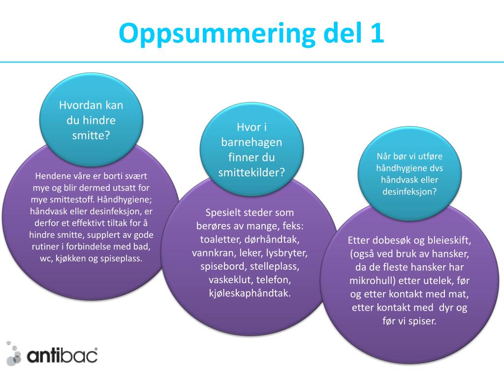 Materiell tilpasset barna Antibac har laget opplæringsmateriell for både ansatte og barn i barnehagene. Dette har vi gjort i samarbeid med Vera Edel Anthonsen som er en guru innen hygiene i barnehager. ..se forslag til morsomme og lærerike aktiviteter.. ..møt figurene Hendi og Handy, og bakteriene Smitte og Smusse.. Lettfattelig og underholdene materiell Eksempel på bilde fra materiellet til barna samlet i en A3 flip-over med tekst på baksiden for å gjøre det enkelt for de voksne å snakke om temaene. Hvordan vasker vi hendene?melodi: Mikkel Rev Først litt vannsåpe på gni nå så det skummerskikkelig rundt fingre tiSkyll bort alt – så tørketid! - Nå roper alle jippi!