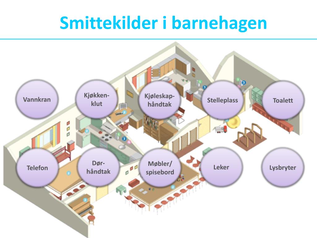 Smitte i barnehagen Luftveisinfeksjoner som gir hoste og nysing, samt infeksjoner i tarmen som gir oppkast og diaré, har høy forekomst i barnehager. Disse er veldig smittsomme. Virus og bakterier kan sveve i luften i lengre tid. Du kan derfor bli smittet ved å ta på punkter med smitte eller puste inn smittestoff. Fokus på håndhygiene og rutiner for rengjøring av flater som berøres ofte kan redusere smitte med opptil 70%.