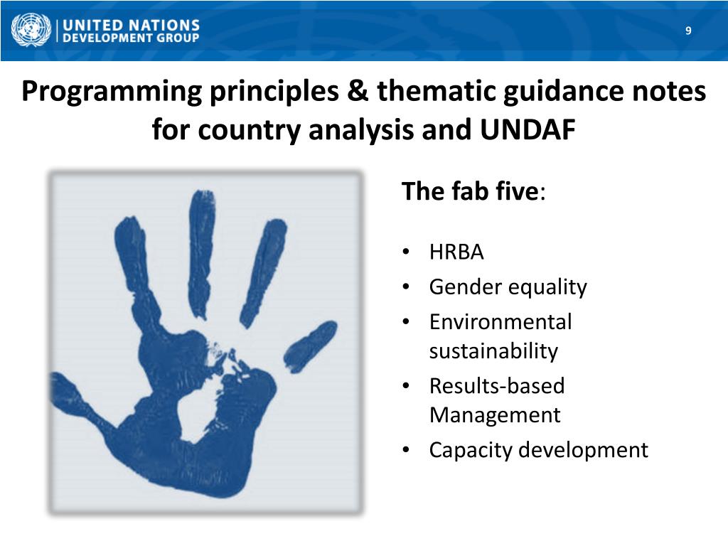 Programming principles & thematic guidance notes for country analysis and UNDAF 9 The fab five: • HRBA • Gender equality • Environmental sustainability • Results-based Management • Capacity development