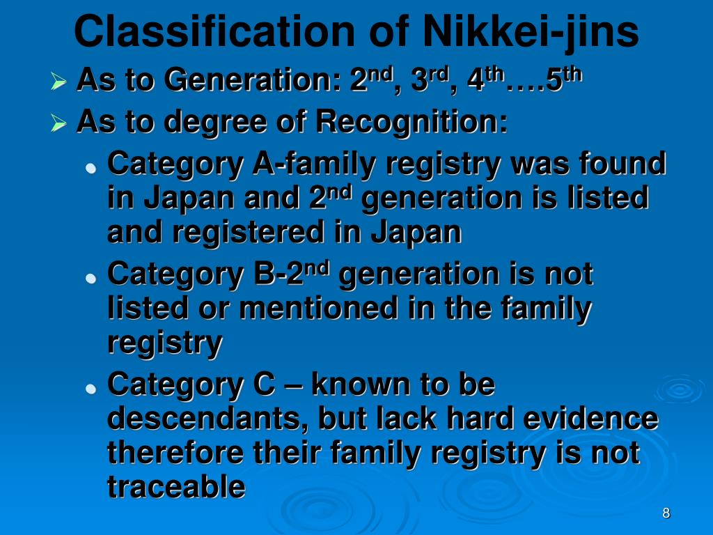 As to Generation: 2nd, 3rd, 4th….5th As to degree of Recognition: Category A-family registry was found in Japan and 2nd generation is listed and registered in Japan Category B-2nd generation is not listed or mentioned in the family registry Category C – known to be descendants, but lack hard evidence therefore their family registry is not traceable Classification of Nikkei-jins