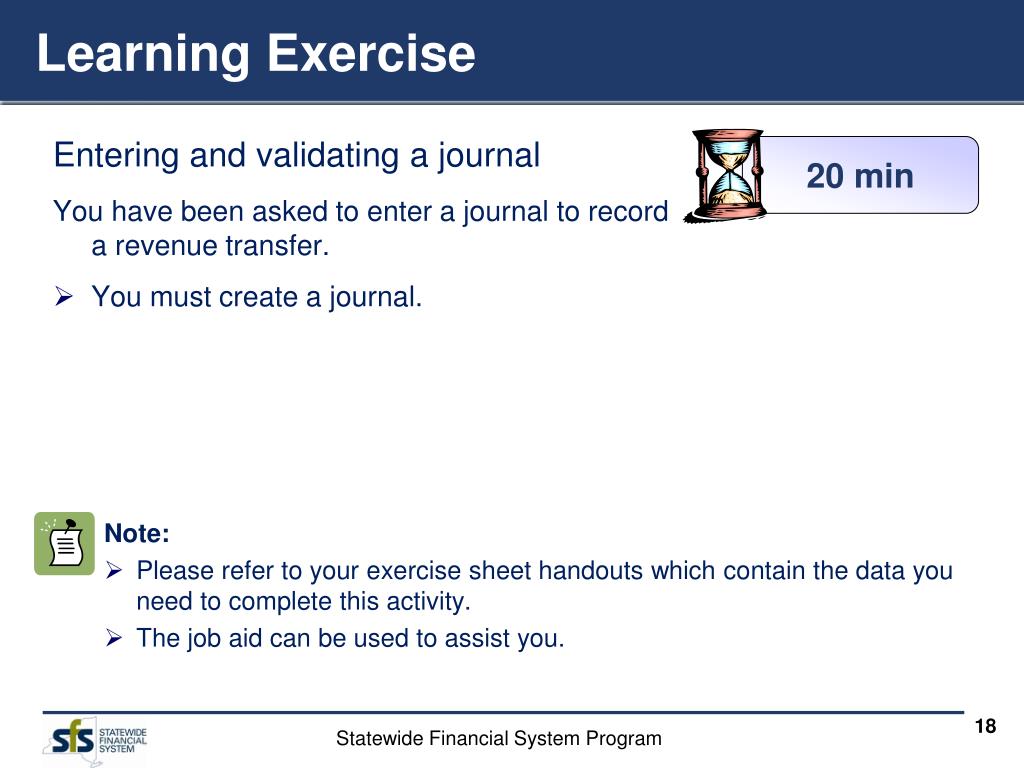 Learning Exercise 20 min Note: • Please refer to your exercise sheet handouts which contain the data you need to complete this activity. • The job aid can be used to assist you. Entering and validating a journal You have been asked to enter a journal to record a revenue transfer. You must create a journal.