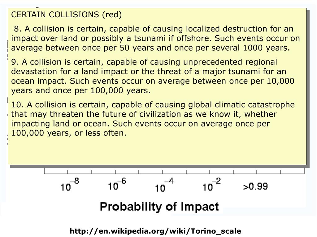 CERTAIN COLLISIONS (red) 8. A collision is certain, capable of causing localized destruction for an impact over land or possibly a tsunami if offshore. Such events occur on average between once per 50 years and once per several 1000 years. 9. A collision is certain, capable of causing unprecedented regional devastation for a land impact or the threat of a major tsunami for an ocean impact. Such events occur on average between once per 10,000 years and once per 100,000 years. 10. A collision is certain, capable of causing global climatic catastrophe that may threaten the future of civilization as we know it, whether impacting land or ocean. Such events occur on average once per 100,000 years, or less often. http://en.wikipedia.org/wiki/Torino_scale
