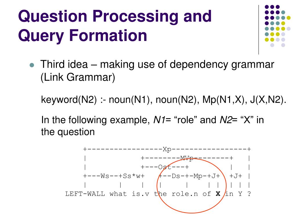 Question Processing and Query Formation • Third idea – making use of dependency grammar (Link Grammar) keyword(N2) :- noun(N1), noun(N2), Mp(N1,X), J(X,N2). In the following example, N1= “role” and N2= “X” in the question +-----------------Xp-----------------+ | +--------MVp--------+ | | +---Ost---+ | | +---Ws--+Ss*w+ +--Ds-+-Mp-+J+ +J+ | | | | | | | | | | | LEFT-WALL what is.v the role.n of X in Y ?