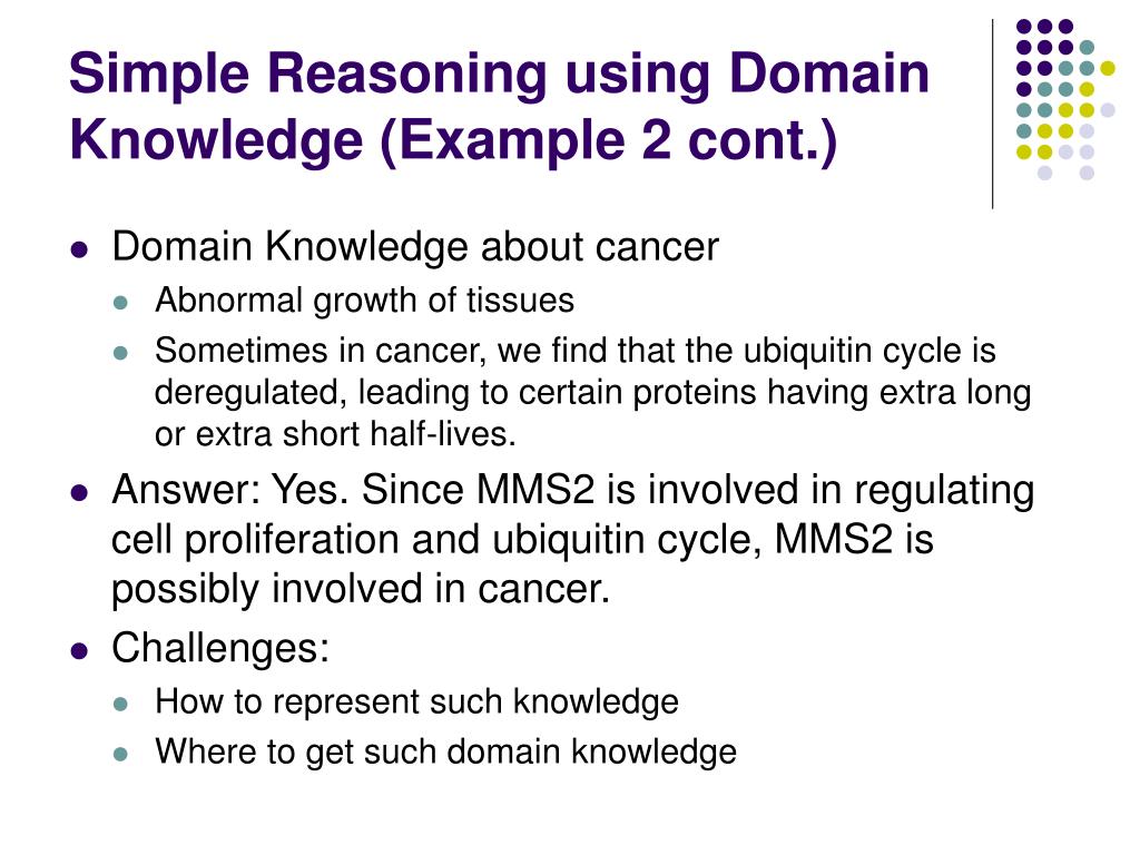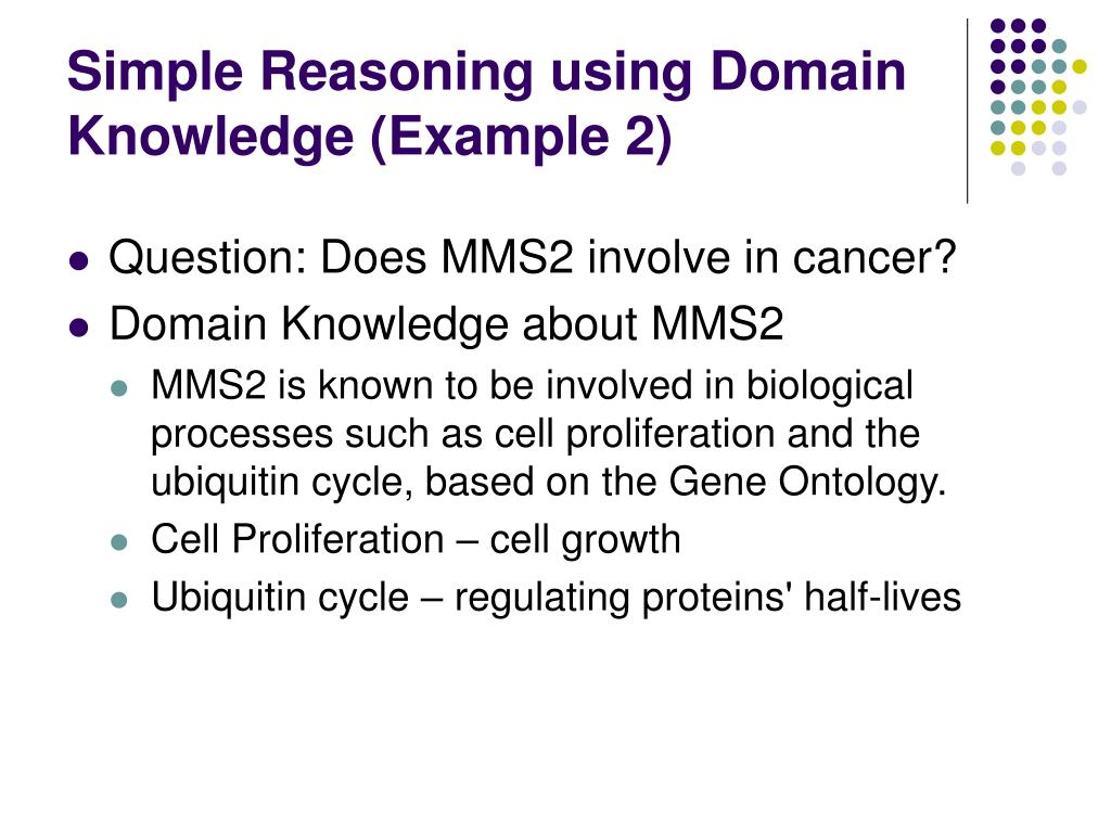 Simple Reasoning using Domain Knowledge (Example 2) • Question: Does MMS2 involve in cancer? • Domain Knowledge about MMS2 • MMS2 is known to be involved in biological processes such as cell proliferation and the ubiquitin cycle, based on the Gene Ontology. • Cell Proliferation – cell growth • Ubiquitin cycle – regulating proteins' half-lives