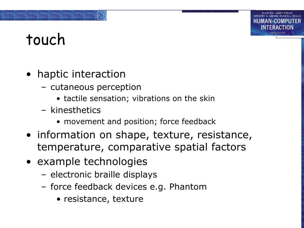 touch • haptic interaction • cutaneous perception • tactile sensation; vibrations on the skin • kinesthetics • movement and position; force feedback • information on shape, texture, resistance, temperature, comparative spatial factors • example technologies • electronic braille displays • force feedback devices e.g. Phantom • resistance, texture