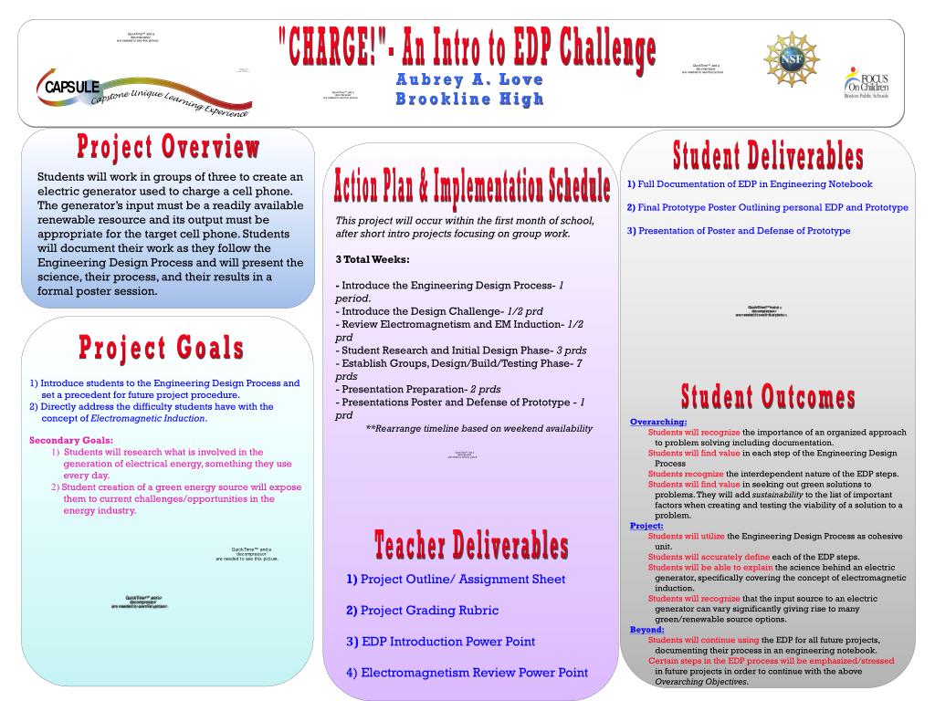 "CHARGE!"- An Intro to EDP Challenge. Aubrey A. Love Brookline High. Project Overview. Student Deliverables. Action Plan & Implementation Schedule.