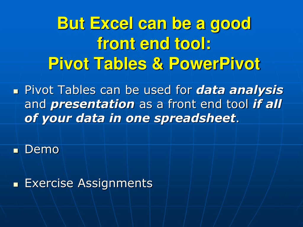 But Excel can be a good front end tool: Pivot Tables & PowerPivot Pivot Tables can be used for data analysis and presentation as a front end tool if all of your data in one spreadsheet. Demo Exercise Assignments