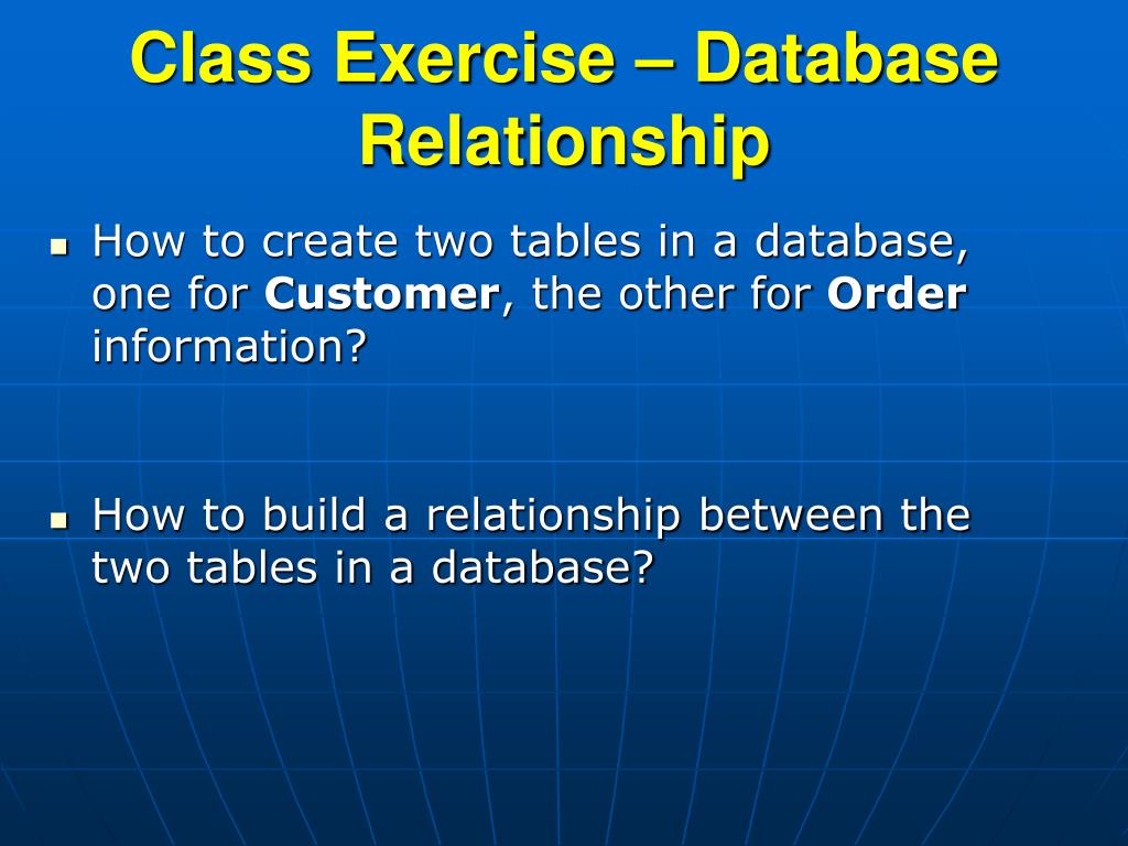 Class Exercise – Database Relationship How to create two tables in a database, one for Customer, the other for Order information? How to build a relationship between the two tables in a database?