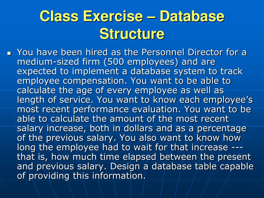 Class Exercise – Database Structure • You have been hired as the Personnel Director for a medium-sized firm (500 employees) and are expected to implement a database system to track employee compensation. You want to be able to calculate the age of every employee as well as length of service. You want to know each employee’s most recent performance evaluation. You want to be able to calculate the amount of the most recent salary increase, both in dollars and as a percentage of the previous salary. You also want to know how long the employee had to wait for that increase --- that is, how much time elapsed between the present and previous salary. Design a database table capable of providing this information.