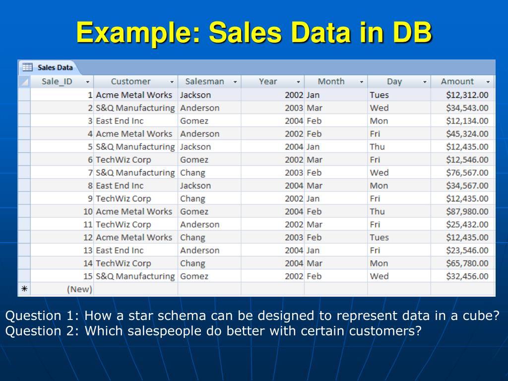 Example: Sales Data in DB Question 1: How a star schema can be designed to represent data in a cube? Question 2: Which salespeople do better with certain customers?
