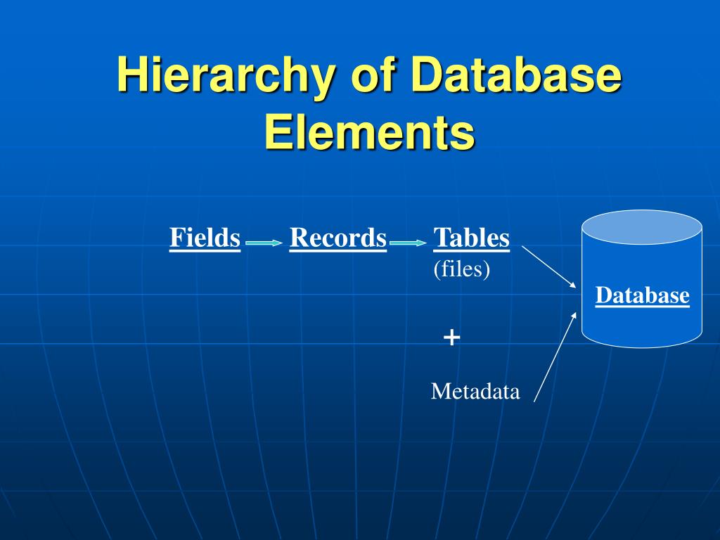 Hierarchy of Database Elements Fields Records Tables(files) Database + Metadata