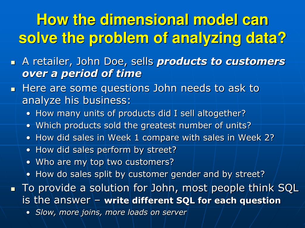 How the dimensional model can solve the problem of analyzing data? • A retailer, John Doe, sells products to customers over a period of time • Here are some questions John needs to ask to analyze his business: • How many units of products did I sell altogether? • Which products sold the greatest number of units? • How did sales in Week 1 compare with sales in Week 2? • How did sales perform by street? • Who are my top two customers? • How do sales split by customer gender and by street? • To provide a solution for John, most people think SQL is the answer – write different SQL for each question • Slow, more joins, more loads on server