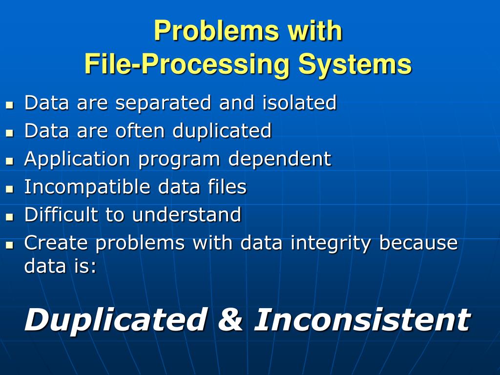 Problems with File-Processing Systems • Data are separated and isolated • Data are often duplicated • Application program dependent • Incompatible data files • Difficult to understand • Create problems with data integrity because data is: Duplicated & Inconsistent