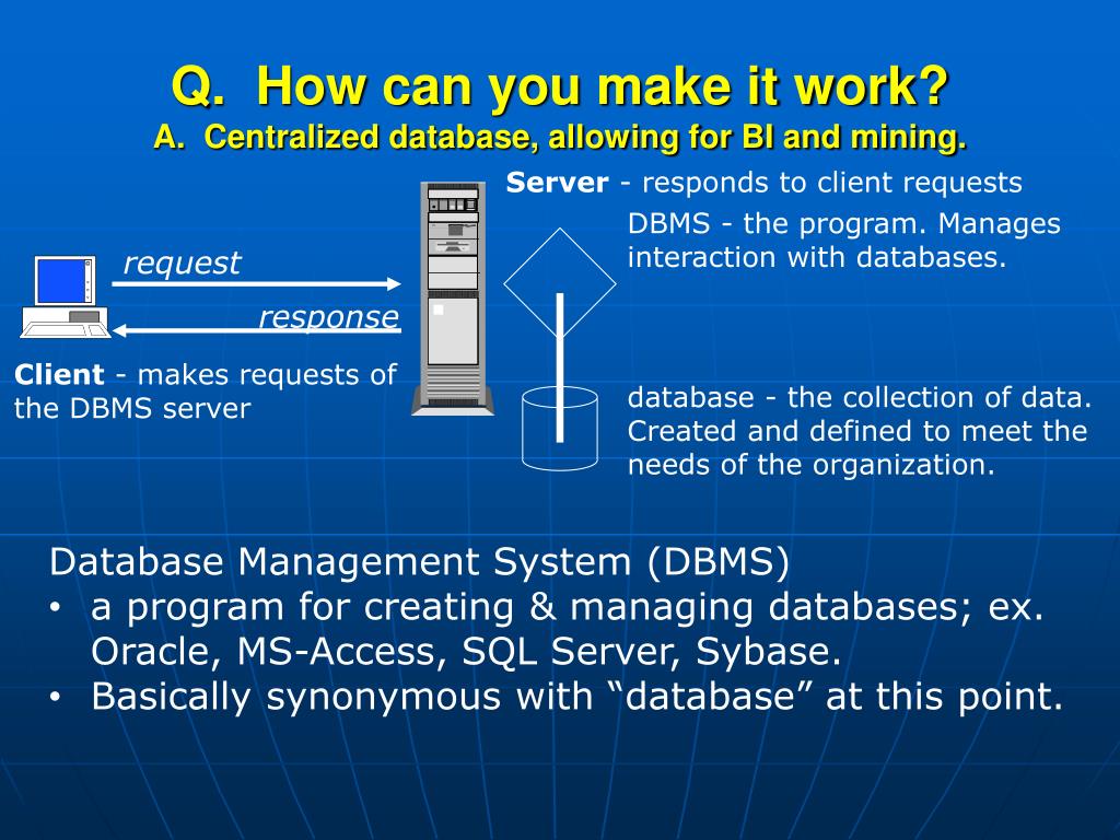Q. How can you make it work?A. Centralized database, allowing for BI and mining. Server - responds to client requests DBMS - the program. Manages interaction with databases. request response Client - makes requests of the DBMS server database - the collection of data. Created and defined to meet the needs of the organization. • Database Management System (DBMS) • a program for creating & managing databases; ex. Oracle, MS-Access, SQL Server, Sybase. • Basically synonymous with “database” at this point.