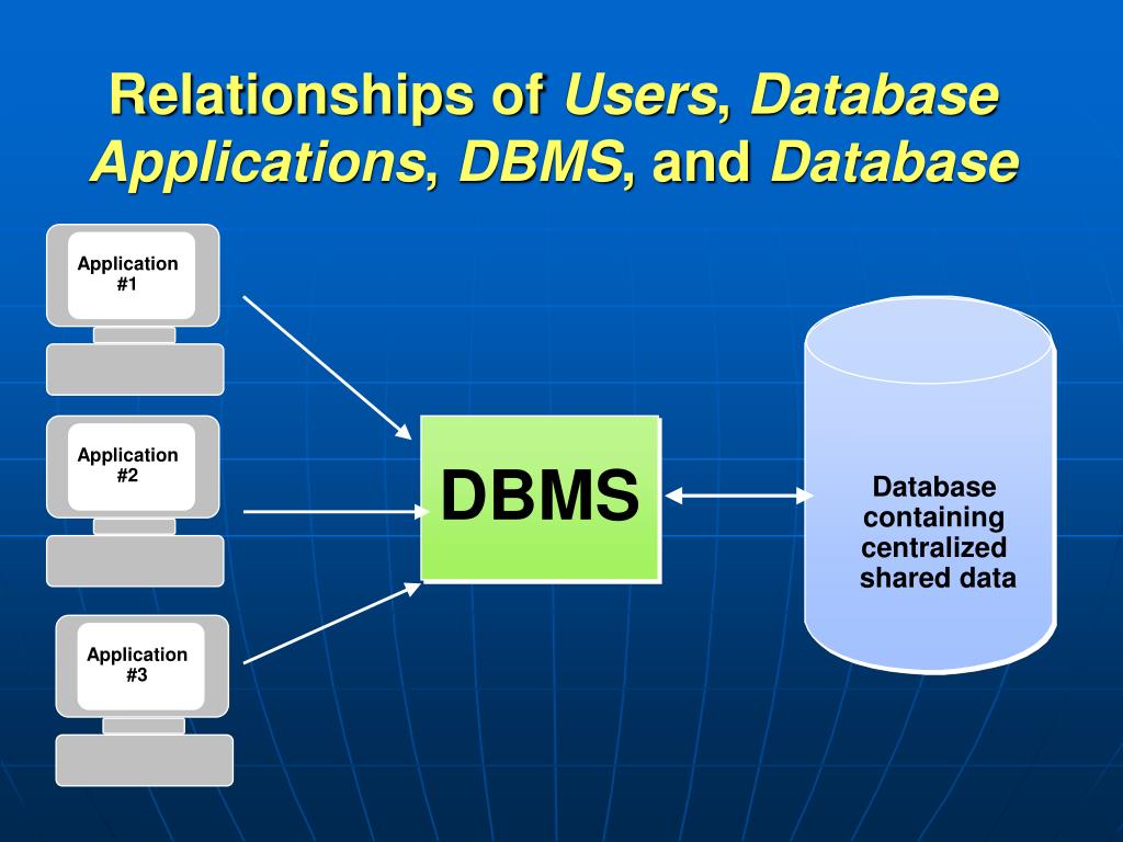 Application #1 Application #2 Application #3 DBMS Database containing centralized shared data Relationships of Users, Database Applications, DBMS, and Database