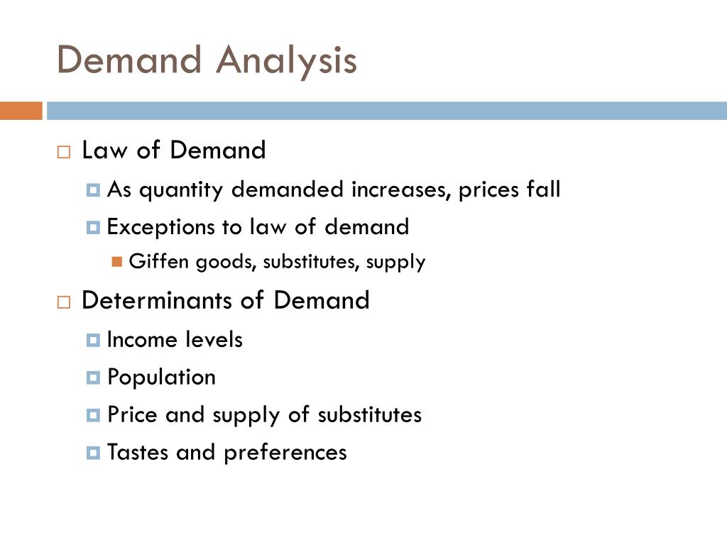 Demand Analysis • Law of Demand • As quantity demanded increases, prices fall • Exceptions to law of demand • Giffen goods, substitutes, supply • Determinants of Demand • Income levels • Population • Price and supply of substitutes • Tastes and preferences