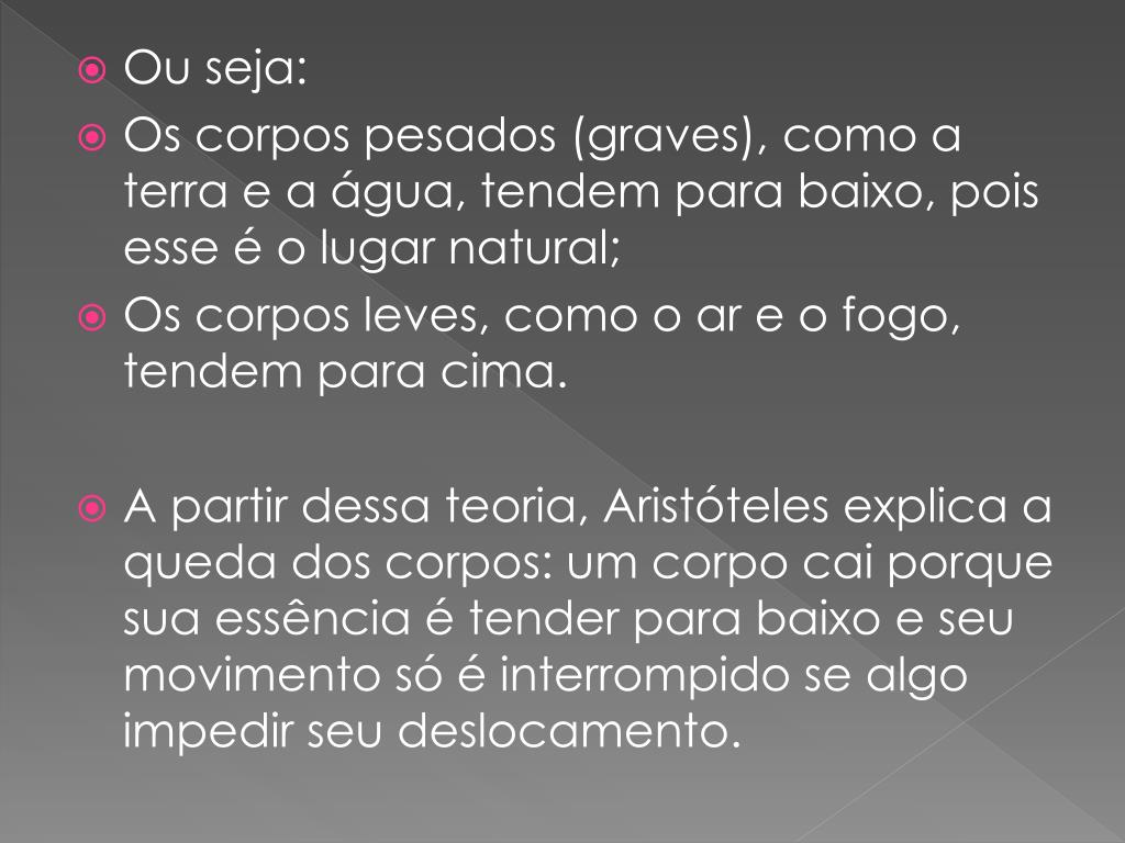 Ou seja: • Os corpos pesados (graves), como a terra e a água, tendem para baixo, pois esse é o lugar natural; • Os corpos leves, como o ar e o fogo, tendem para cima. • A partir dessa teoria, Aristóteles explica a queda dos corpos: um corpo cai porque sua essência é tender para baixo e seu movimento só é interrompido se algo impedir seu deslocamento.