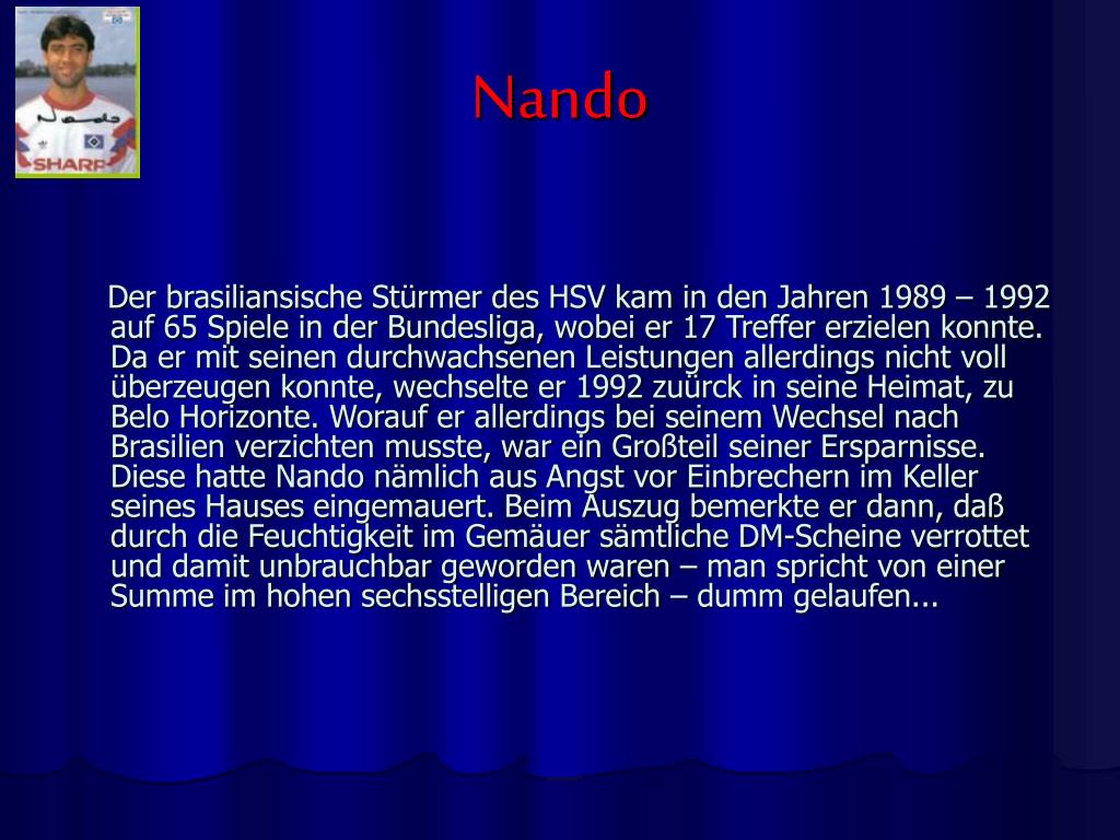 Nando Der brasiliansische Stürmer des HSV kam in den Jahren 1989 – 1992 auf 65 Spiele in der Bundesliga, wobei er 17 Treffer erzielen konnte. Da er mit seinen durchwachsenen Leistungen allerdings nicht voll überzeugen konnte, wechselte er 1992 zuürck in seine Heimat, zu Belo Horizonte. Worauf er allerdings bei seinem Wechsel nach Brasilien verzichten musste, war ein Großteil seiner Ersparnisse. Diese hatte Nando nämlich aus Angst vor Einbrechern im Keller seines Hauses eingemauert. Beim Auszug bemerkte er dann, daß durch die Feuchtigkeit im Gemäuer sämtliche DM-Scheine verrottet und damit unbrauchbar geworden waren – man spricht von einer Summe im hohen sechsstelligen Bereich – dumm gelaufen...