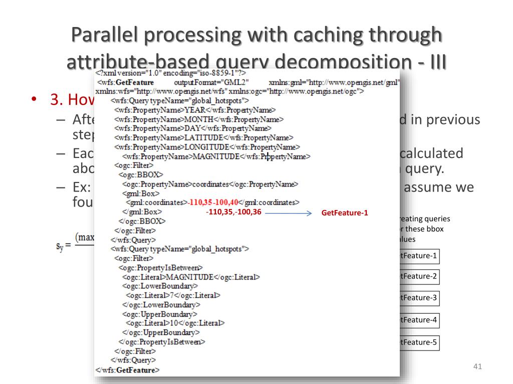Creating queries for these bbox values Decomposing the rectangle according to Pn and sy -110, 35, -100, 36 GetFeature-1 A rectangle from the rectangulation process -110, 36, -100, 37 GetFeature-2 GetFeature-3 -110, 35, -100, 40 -110, 37, -100, 38 -110, 38, -100, 39 GetFeature-4 -110, 39, -100, 40 GetFeature-5 Parallel processing with caching through attribute-based query decomposition - III • 3. How to created sub-queries • After having partitioned regions’ bbox values printed in previous step, corresponding sub-queries are created. • Each partition is differentiated by their bbox values calculated above. Other attributes are inherited from the main query. • Ex: main query bbox is “-110, 35, -100, 40” and let’s assume we found out that Pn=5 -110,35,-100,36 GetFeature-1
