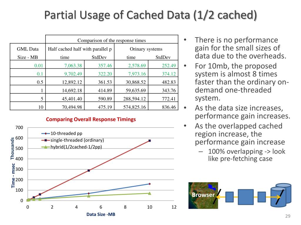 Partial Usage of Cached Data (1/2 cached) • There is no performance gain for the small sizes of data due to the overheads. • For 10mb, the proposed system is almost 8 times faster than the ordinary on-demand one-threaded system. • As the data size increases, performance gain increases. • As the overlapped cached region increase, the performance gain increase • 100% overlapping -> look like pre-fetching case Browser