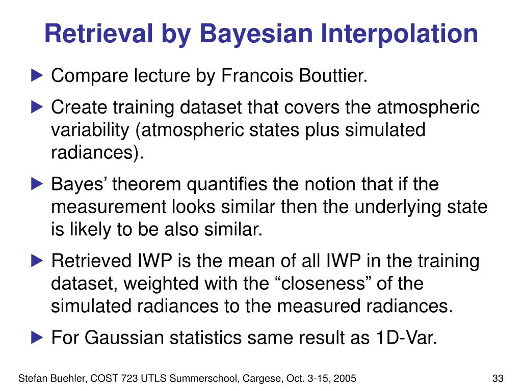 Retrieval by Bayesian Interpolation • Compare lecture by Francois Bouttier. • Create training dataset that covers the atmospheric variability (atmospheric states plus simulated radiances). • Bayes’ theorem quantifies the notion that if the measurement looks similar then the underlying state is likely to be also similar. • Retrieved IWP is the mean of all IWP in the training dataset, weighted with the “closeness” of the simulated radiances to the measured radiances. • For Gaussian statistics same result as 1D-Var.