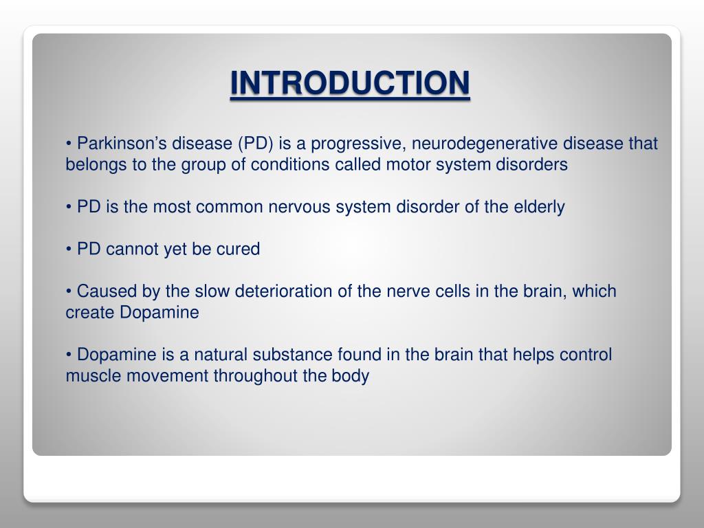 • Parkinson’s disease (PD) is a progressive, neurodegenerative disease that belongs to the group of conditions called motor system disorders • PD is the most common nervous system disorder of the elderly • PD cannot yet be cured • Caused by the slow deterioration of the nerve cells in the brain, which create Dopamine • Dopamine is a natural substance found in the brain that helps control muscle movement throughout the body INTRODUCTION