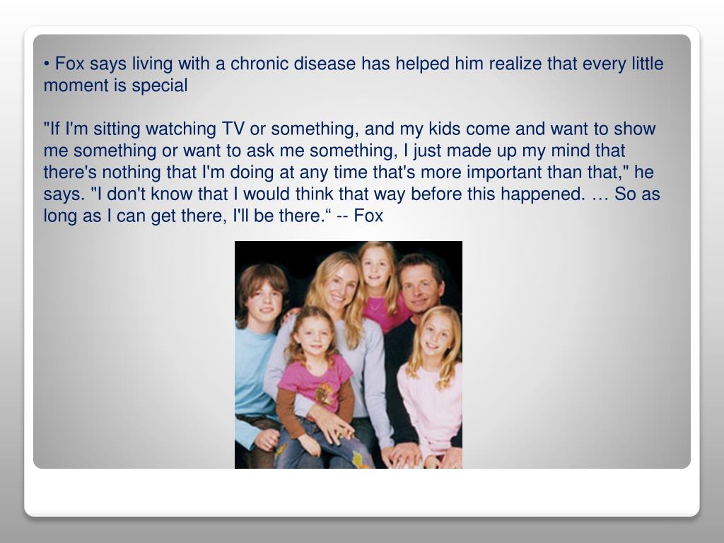 • Fox says living with a chronic disease has helped him realize that every little moment is special "If I'm sitting watching TV or something, and my kids come and want to show me something or want to ask me something, I just made up my mind that there's nothing that I'm doing at any time that's more important than that," he says. "I don't know that I would think that way before this happened. … So as long as I can get there, I'll be there.“ -- Fox