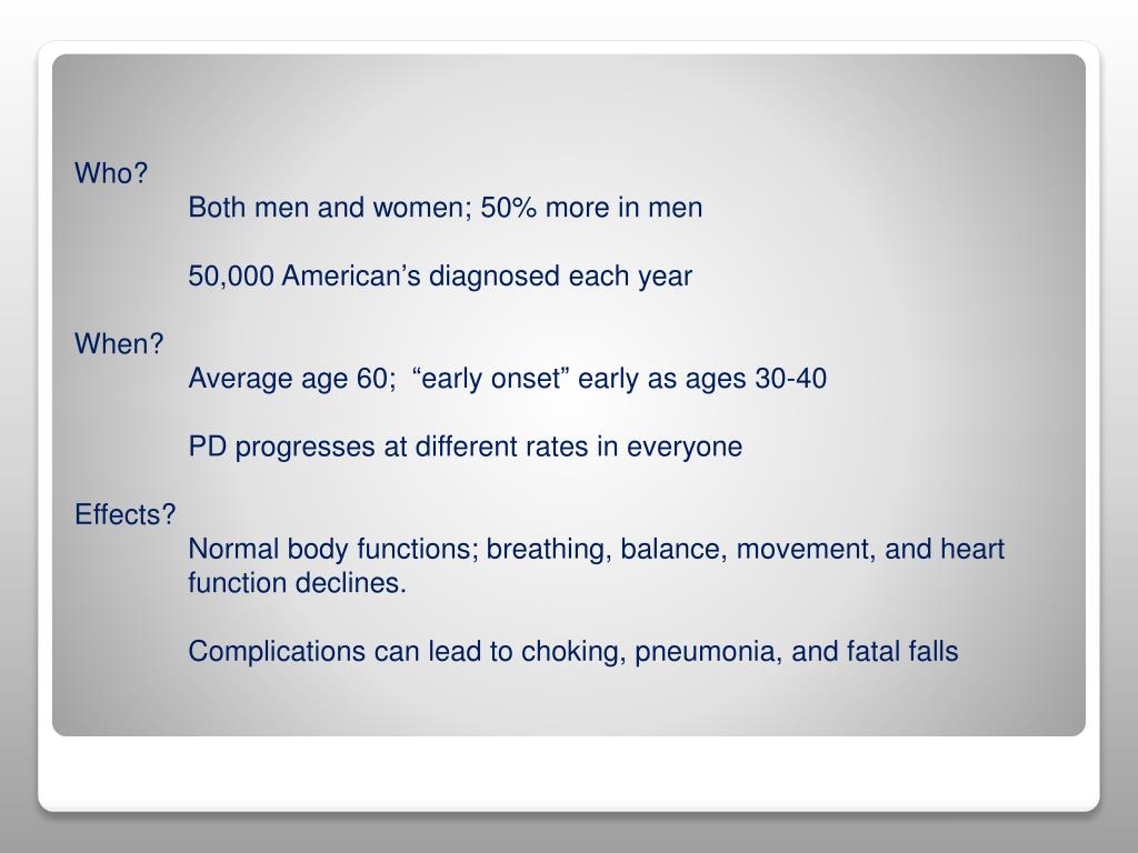 Who? Both men and women; 50% more in men 50,000 American’s diagnosed each year When? Average age 60; “early onset” early as ages 30-40 PD progresses at different rates in everyone Effects? Normal body functions; breathing, balance, movement, and heart function declines. Complications can lead to choking, pneumonia, and fatal falls