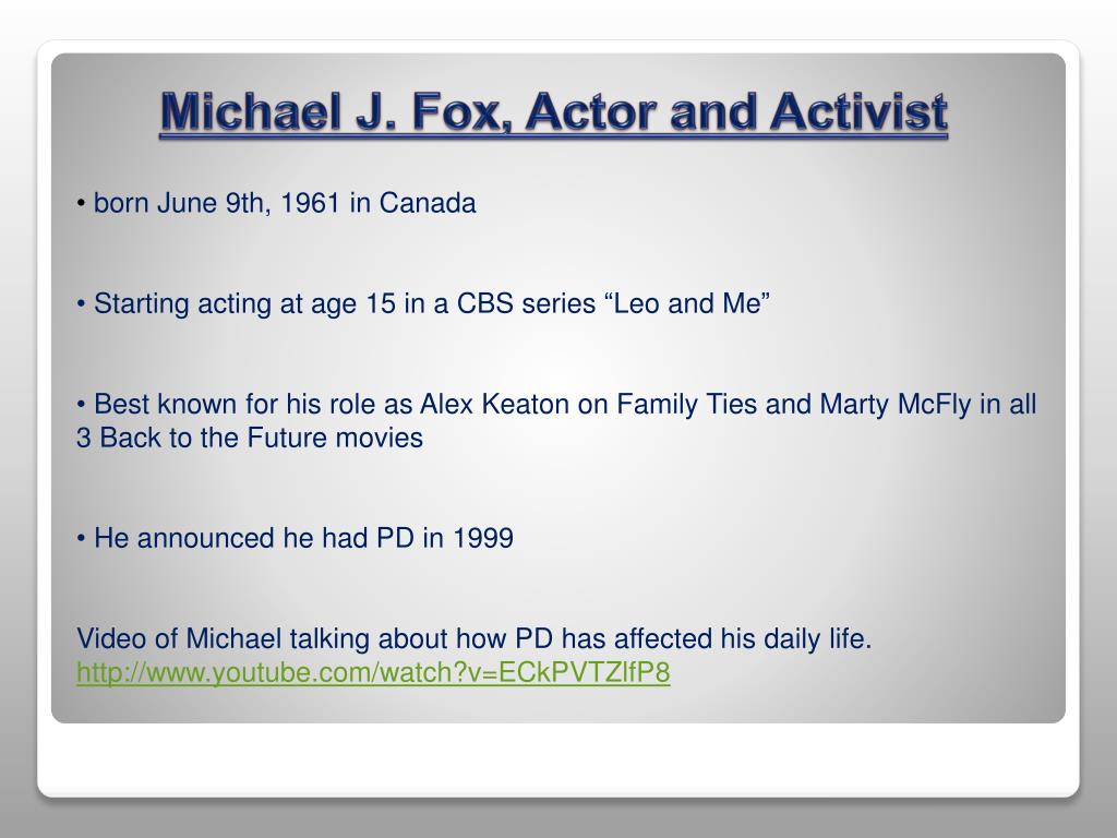 Michael J. Fox, Actor and Activist • born June 9th, 1961 in Canada • Starting acting at age 15 in a CBS series “Leo and Me” • Best known for his role as Alex Keaton on Family Ties and Marty McFly in all 3 Back to the Future movies • He announced he had PD in 1999 Video of Michael talking about how PD has affected his daily life. http://www.youtube.com/watch?v=ECkPVTZlfP8