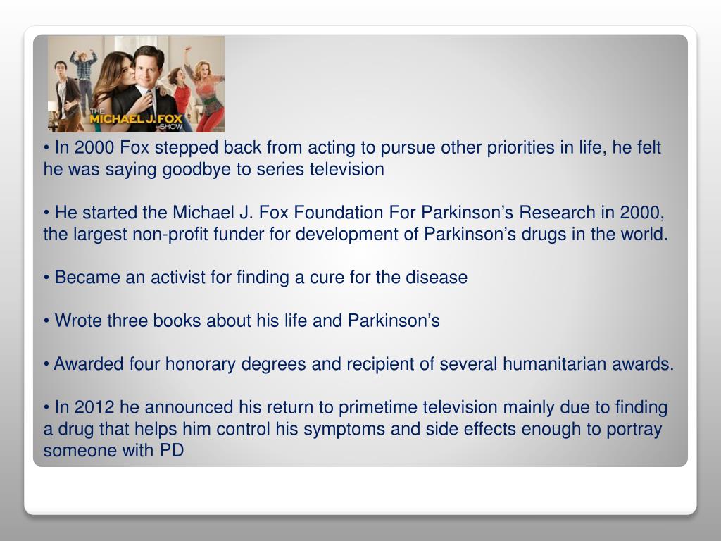• In 2000 Fox stepped back from acting to pursue other priorities in life, he felt he was saying goodbye to series television • • He started the Michael J. Fox Foundation For Parkinson’s Research in 2000, the largest non-profit funder for development of Parkinson’s drugs in the world. • • Became an activist for finding a cure for the disease • • Wrote three books about his life and Parkinson’s • • Awarded four honorary degrees and recipient of several humanitarian awards. • • In 2012 he announced his return to primetime television mainly due to finding a drug that helps him control his symptoms and side effects enough to portray someone with PD