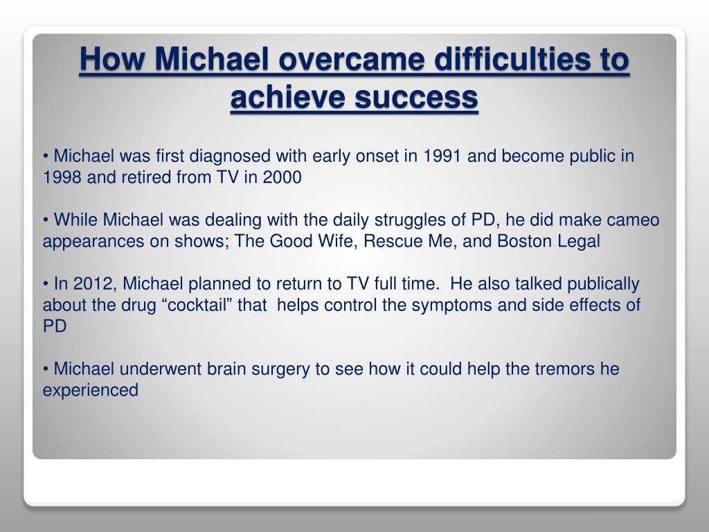 How Michael overcame difficulties to achieve success • Michael was first diagnosed with early onset in 1991 and become public in 1998 and retired from TV in 2000 • While Michael was dealing with the daily struggles of PD, he did make cameo appearances on shows; The Good Wife, Rescue Me, and Boston Legal • In 2012, Michael planned to return to TV full time. He also talked publically about the drug “cocktail” that helps control the symptoms and side effects of PD • Michael underwent brain surgery to see how it could help the tremors he experienced