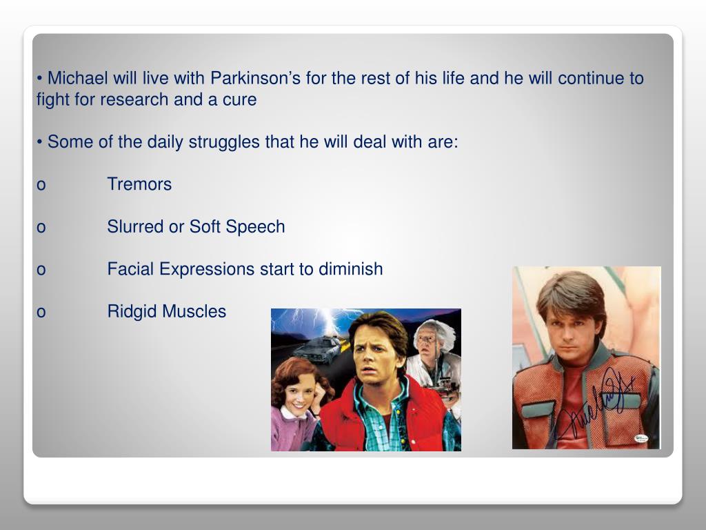 • Michael will live with Parkinson’s for the rest of his life and he will continue to fight for research and a cure • Some of the daily struggles that he will deal with are: o Tremors o Slurred or Soft Speech o Facial Expressions start to diminish o Ridgid Muscles