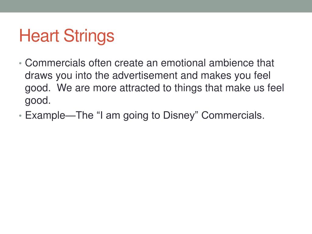 Heart Strings • Commercials often create an emotional ambience that draws you into the advertisement and makes you feel good. We are more attracted to things that make us feel good. • Example—The “I am going to Disney” Commercials.