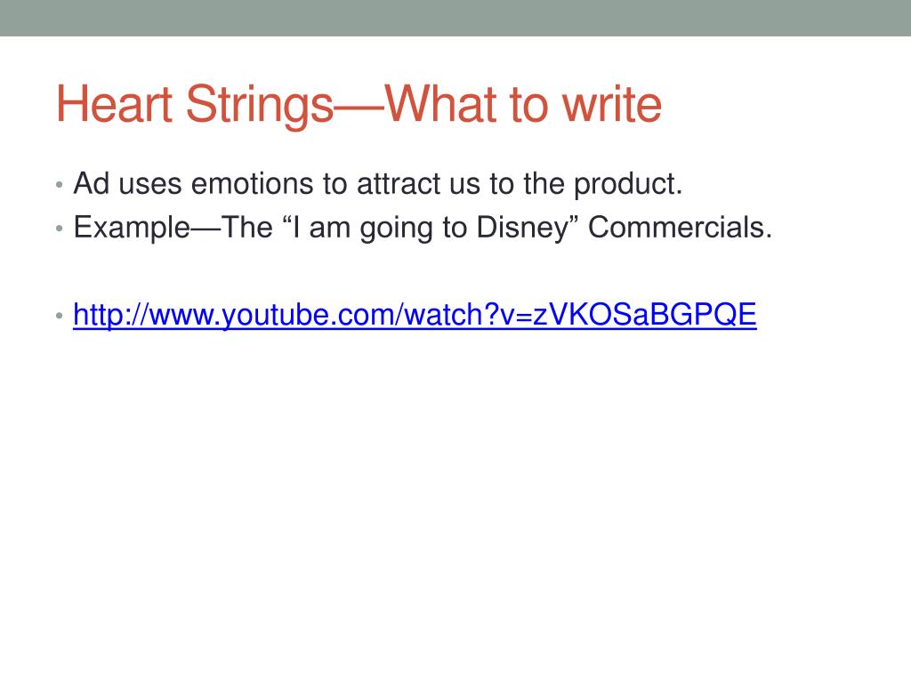 Heart Strings—What to write • Ad uses emotions to attract us to the product. • Example—The “I am going to Disney” Commercials. • http://www.youtube.com/watch?v=zVKOSaBGPQE