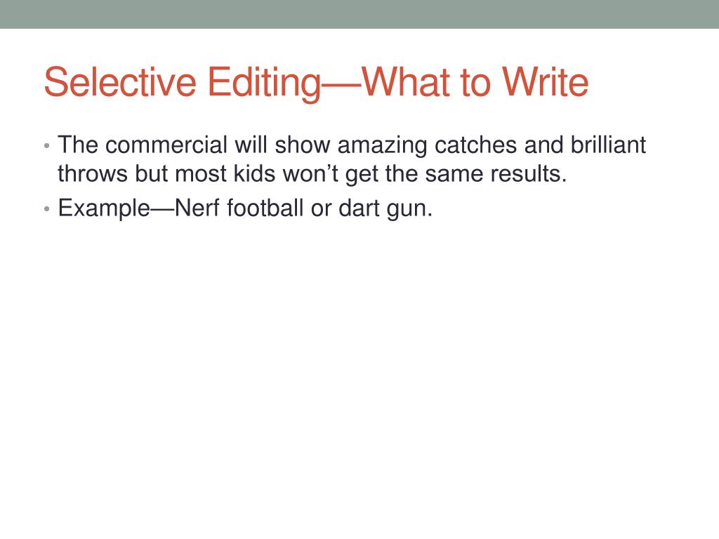 Selective Editing—What to Write • The commercial will show amazing catches and brilliant throws but most kids won’t get the same results. • Example—Nerf football or dart gun.