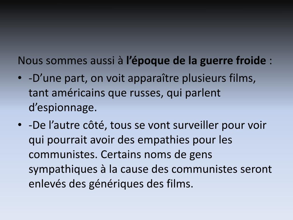 Nous sommes aussi à l’époque de la guerre froide : • -D’une part, on voit apparaître plusieurs films, tant américains que russes, qui parlent d’espionnage. • -De l’autre côté, tous se vont surveiller pour voir qui pourrait avoir des empathies pour les communistes. Certains noms de gens sympathiques à la cause des communistes seront enlevés des génériques des films.