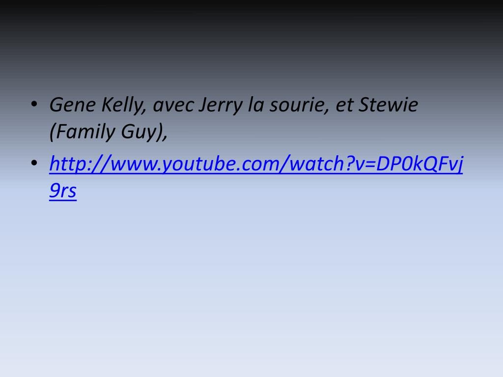 Gene Kelly, avec Jerry la sourie, et Stewie (Family Guy), • http://www.youtube.com/watch?v=DP0kQFvj9rs