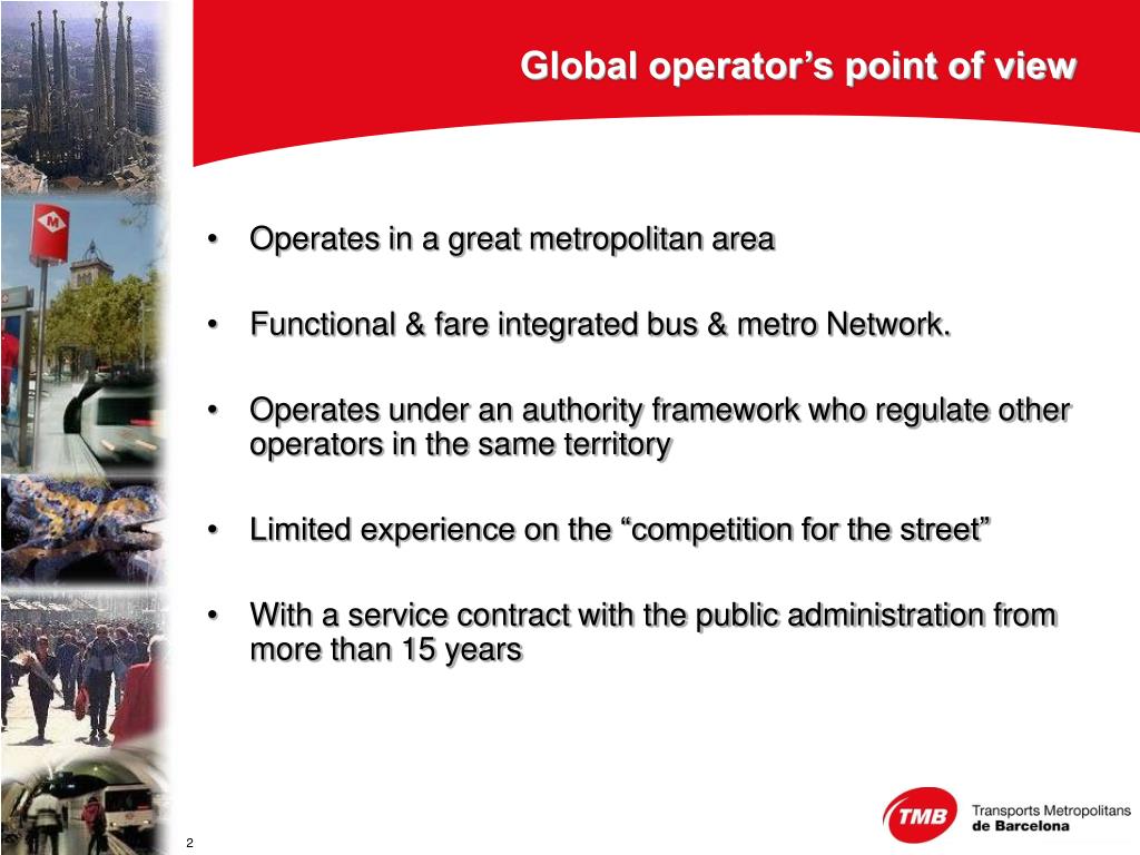 Global operator’s point of view • Operates in a great metropolitan area • Functional & fare integrated bus & metro Network. • Operates under an authority framework who regulate other operators in the same territory • Limited experience on the “competition for the street” • With a service contract with the public administration from more than 15 years