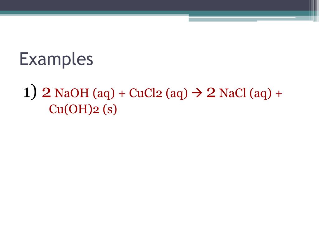Examples 1) 2NaOH (aq) + CuCl2 (aq) 2NaCl (aq) + Cu(OH)2 (s)