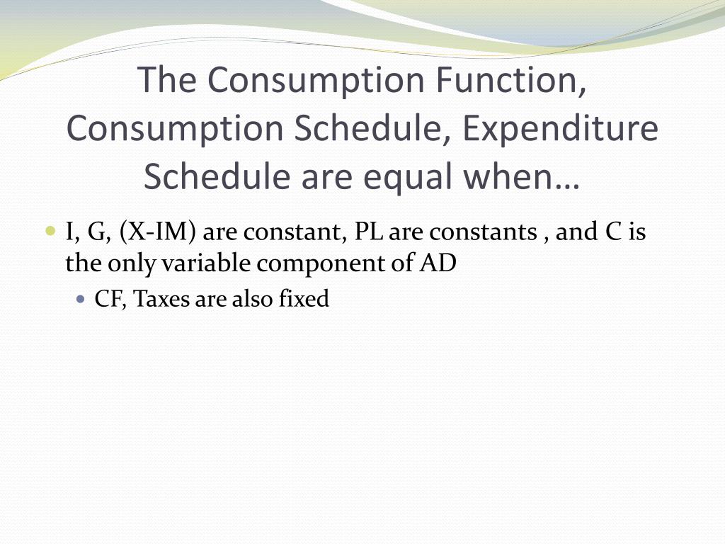 The Consumption Function, Consumption Schedule, Expenditure Schedule are equal when… • I, G, (X-IM) are constant, PL are constants , and C is the only variable component of AD • CF, Taxes are also fixed