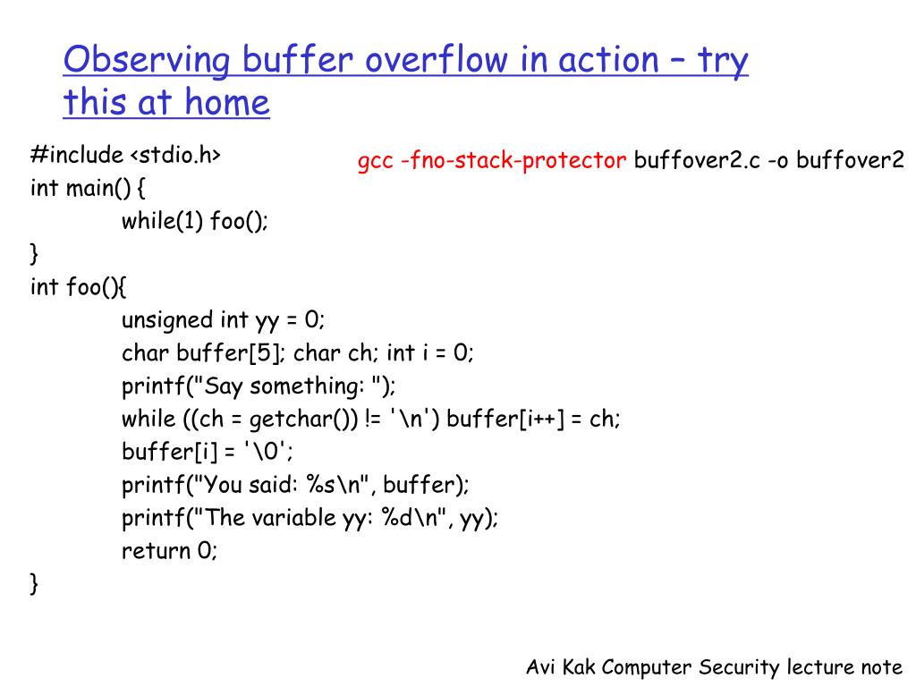 Observing buffer overflow in action – try this at home #include <stdio.h> int main() { while(1) foo(); } int foo(){ unsigned int yy = 0; char buffer[5]; char ch; int i = 0; printf("Say something: "); while ((ch = getchar()) != '\n') buffer[i++] = ch; buffer[i] = '\0'; printf("You said: %s\n", buffer); printf("The variable yy: %d\n", yy); return 0; } gcc -fno-stack-protector buffover2.c -o buffover2 Avi Kak Computer Security lecture note