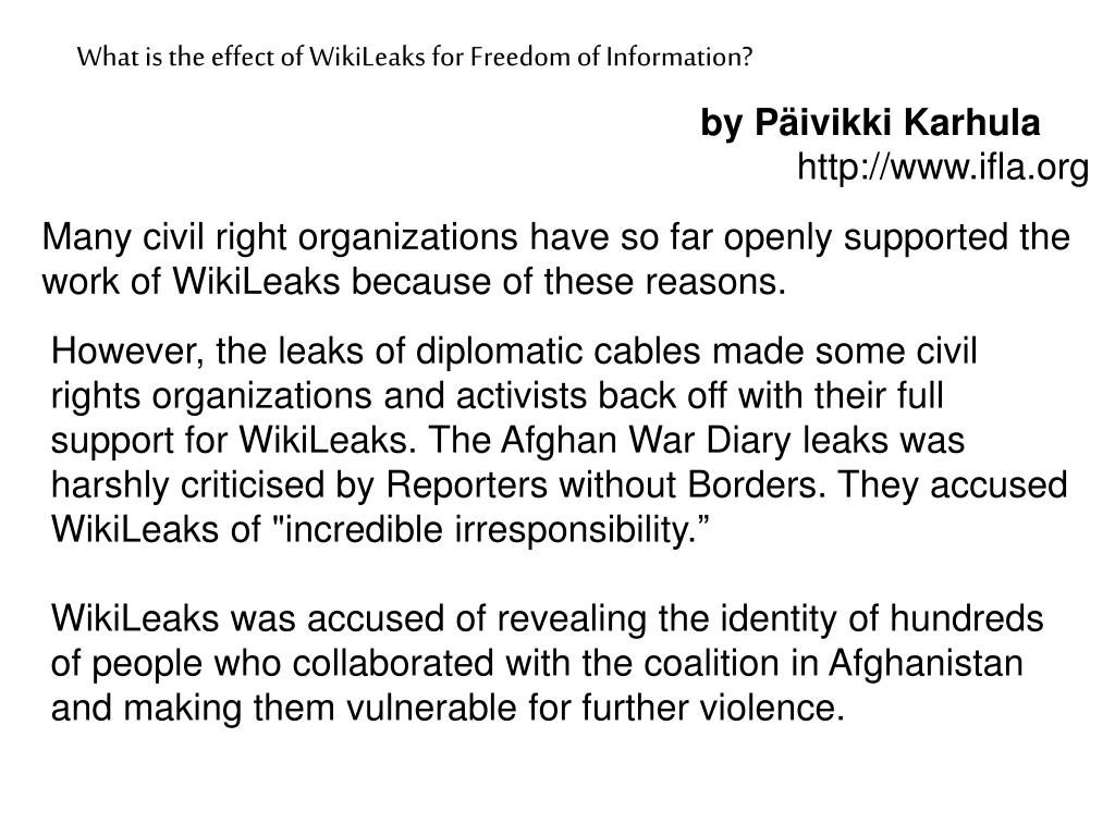 What is the effect of WikiLeaks for Freedom of Information? by Päivikki Karhula http://www.ifla.org Many civil right organizations have so far openly supported the work of WikiLeaks because of these reasons. However, the leaks of diplomatic cables made some civil rights organizations and activists back off with their full support for WikiLeaks. The Afghan War Diary leaks was harshly criticised by Reporters without Borders. They accused WikiLeaks of "incredible irresponsibility.” WikiLeaks was accused of revealing the identity of hundreds of people who collaborated with the coalition in Afghanistan and making them vulnerable for further violence.