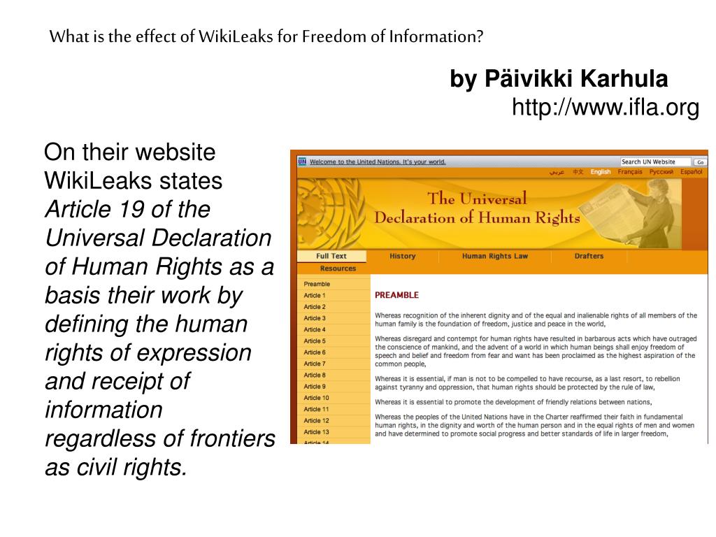 What is the effect of WikiLeaks for Freedom of Information? by Päivikki Karhula http://www.ifla.org On their website WikiLeaks states Article 19 of the Universal Declaration of Human Rights as a basis their work by defining the human rights of expression and receipt of information regardless of frontiers as civil rights.