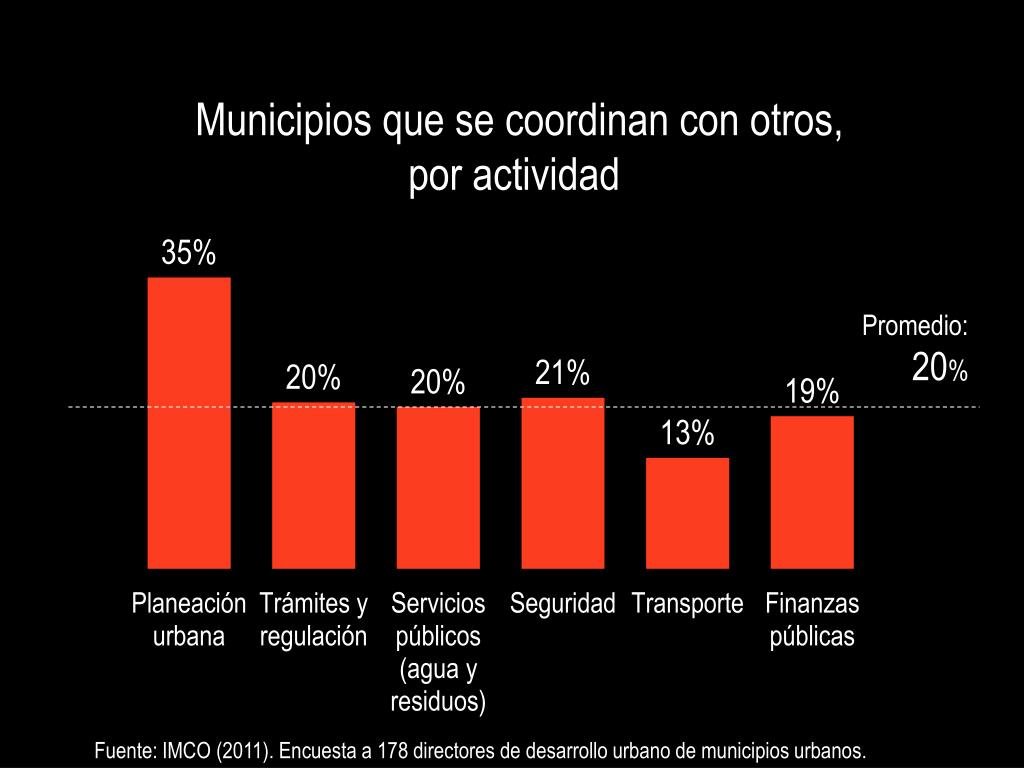 Municipios que se coordinan con otros, por actividad Promedio: 20% Fuente: IMCO (2011). Encuesta a 178 directores de desarrollo urbano de municipios urbanos.
