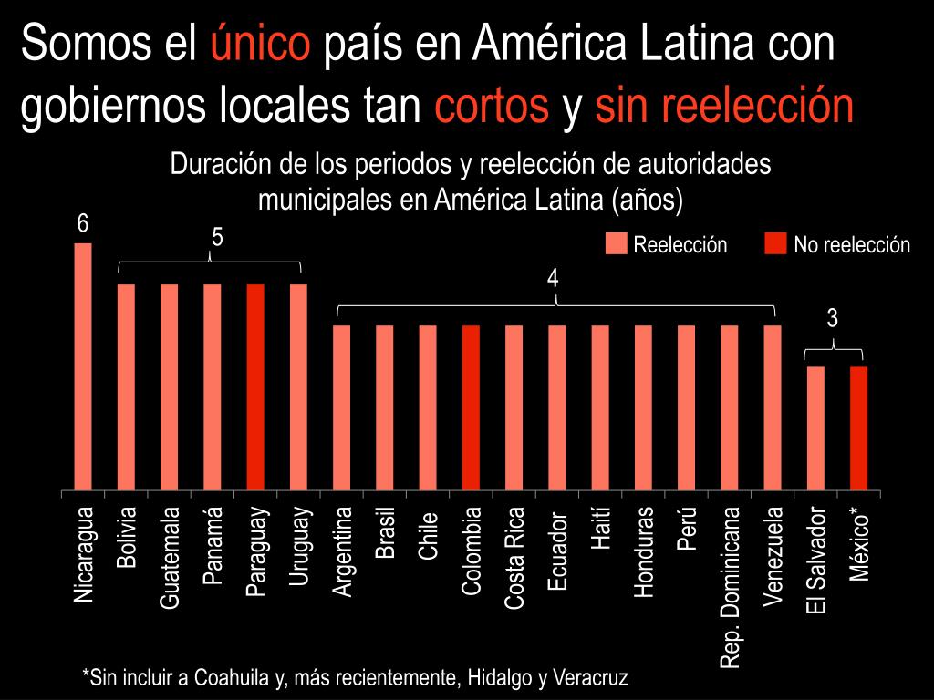 Somos el único país en América Latina con gobiernos locales tan cortos y sin reelección Reelección No reelección *Sin incluir a Coahuila y, más recientemente, Hidalgo y Veracruz