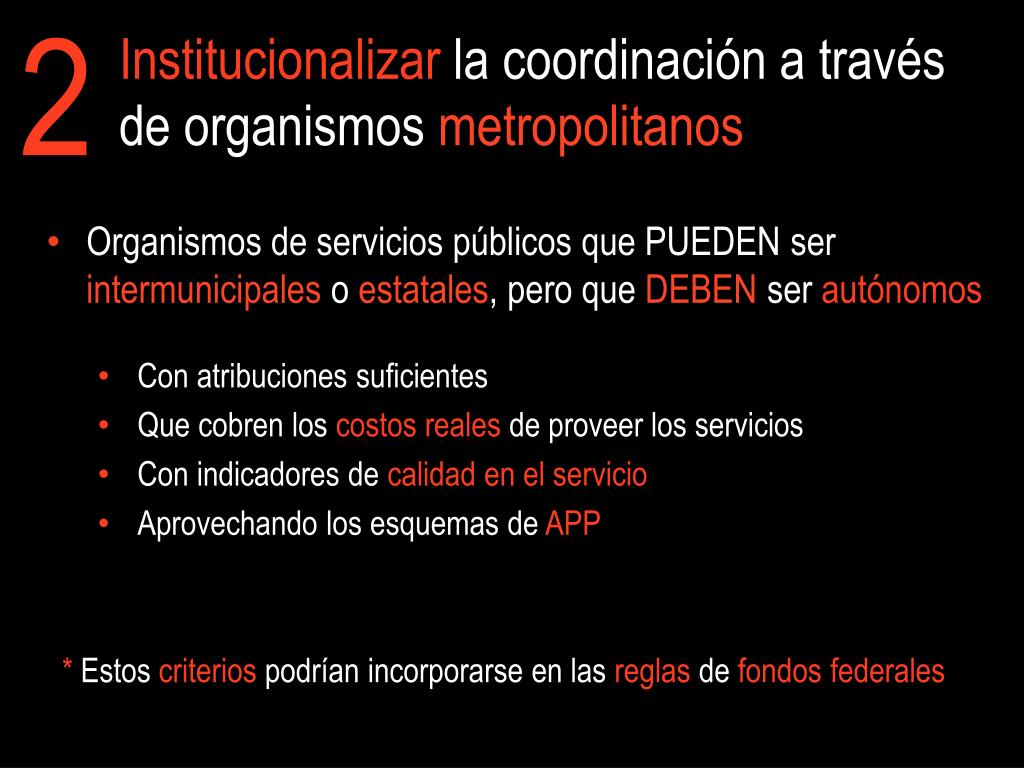 2 Institucionalizar la coordinación a través de organismos metropolitanos • Organismos de servicios públicos que PUEDEN ser intermunicipales o estatales, pero que DEBEN serautónomos • Con atribuciones suficientes • Que cobren los costos reales de proveer los servicios • Con indicadores de calidad en el servicio • Aprovechando los esquemas de APP • * Estos criterios podrían incorporarse en las reglas de fondos federales