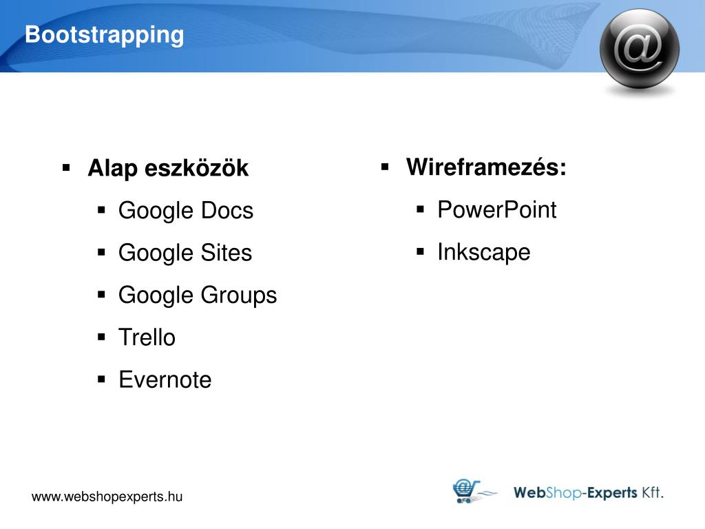 Bootstrapping • Wireframezés: • PowerPoint • Inkscape • Alap eszközök • Google Docs • Google Sites • Google Groups • Trello • Evernote